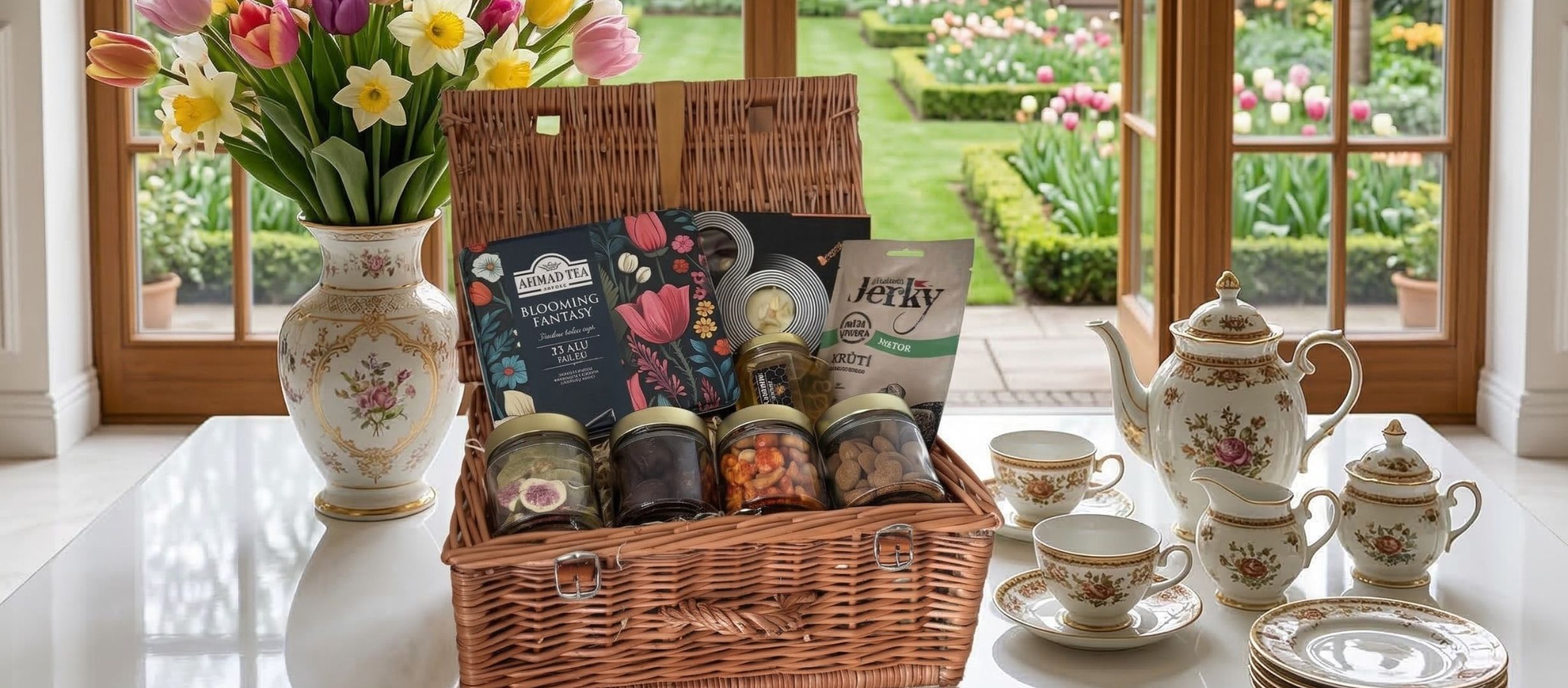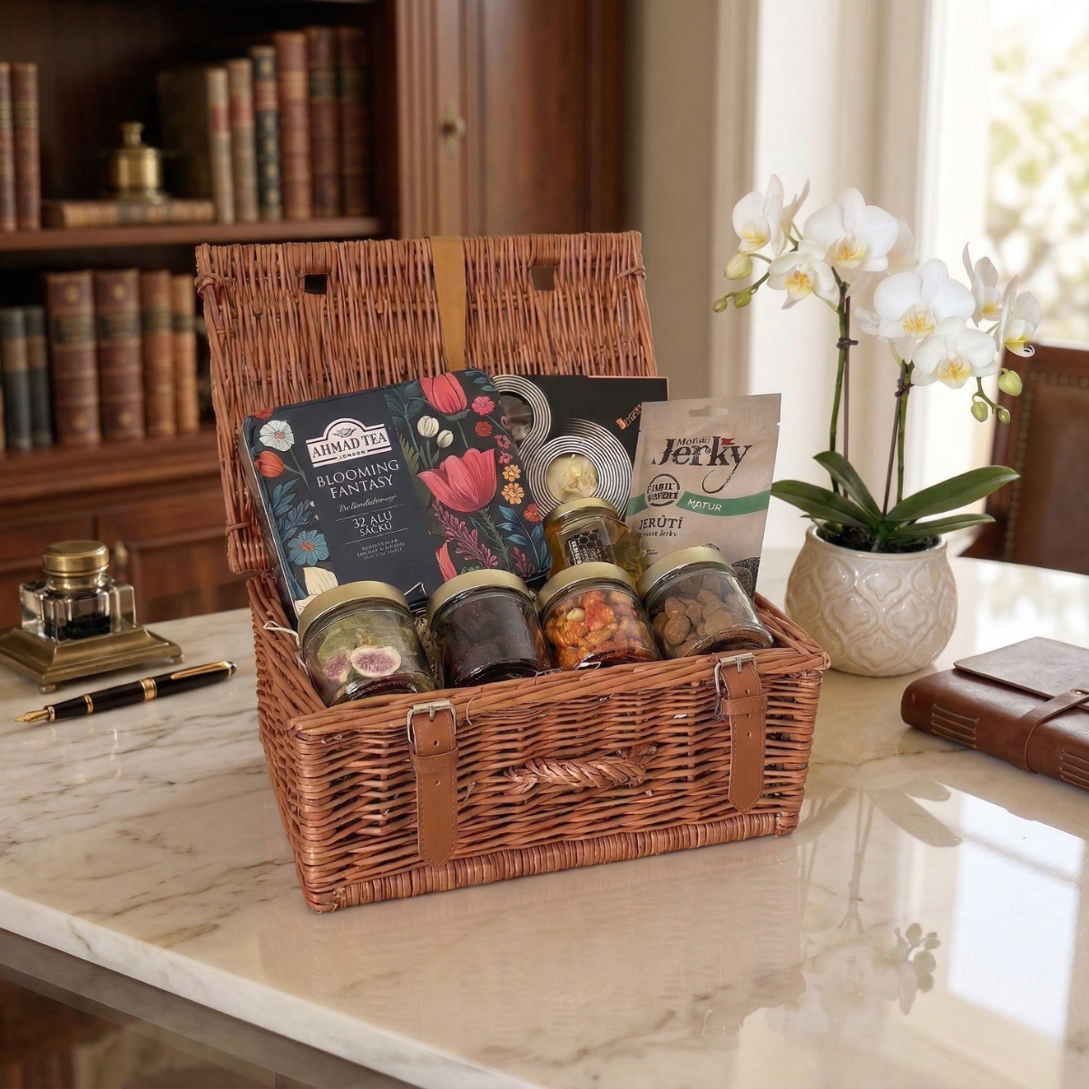 It’s no surprise that Milestone Birthday is one of our most popular gift hampers. The handwoven picnic basket, tied with a golden ribbon, contains a selection of premium teas, raw honey, delicious biscuits, coffee, and nuts. An elegant gift that will delight anyone.